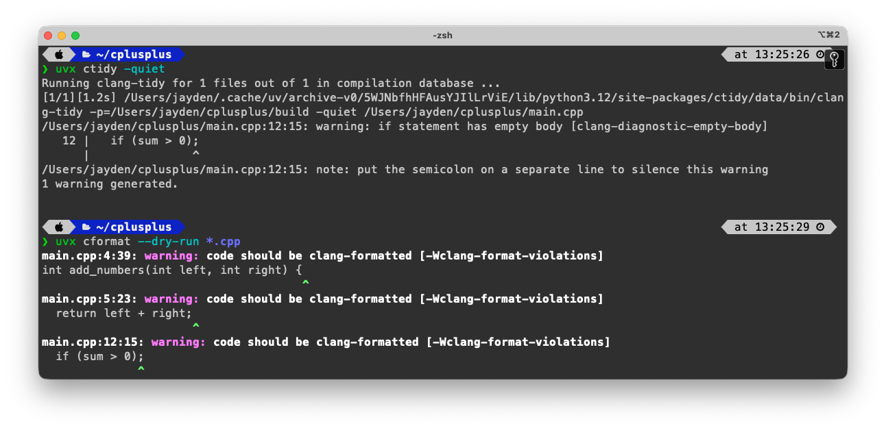 Instead of asking every developer or CI job to install and manage a matching LLVM toolchain by hand, you can install ctidy and cformat with uv and immediately get reproducible clang-tidy and clang-format commands in your environment.